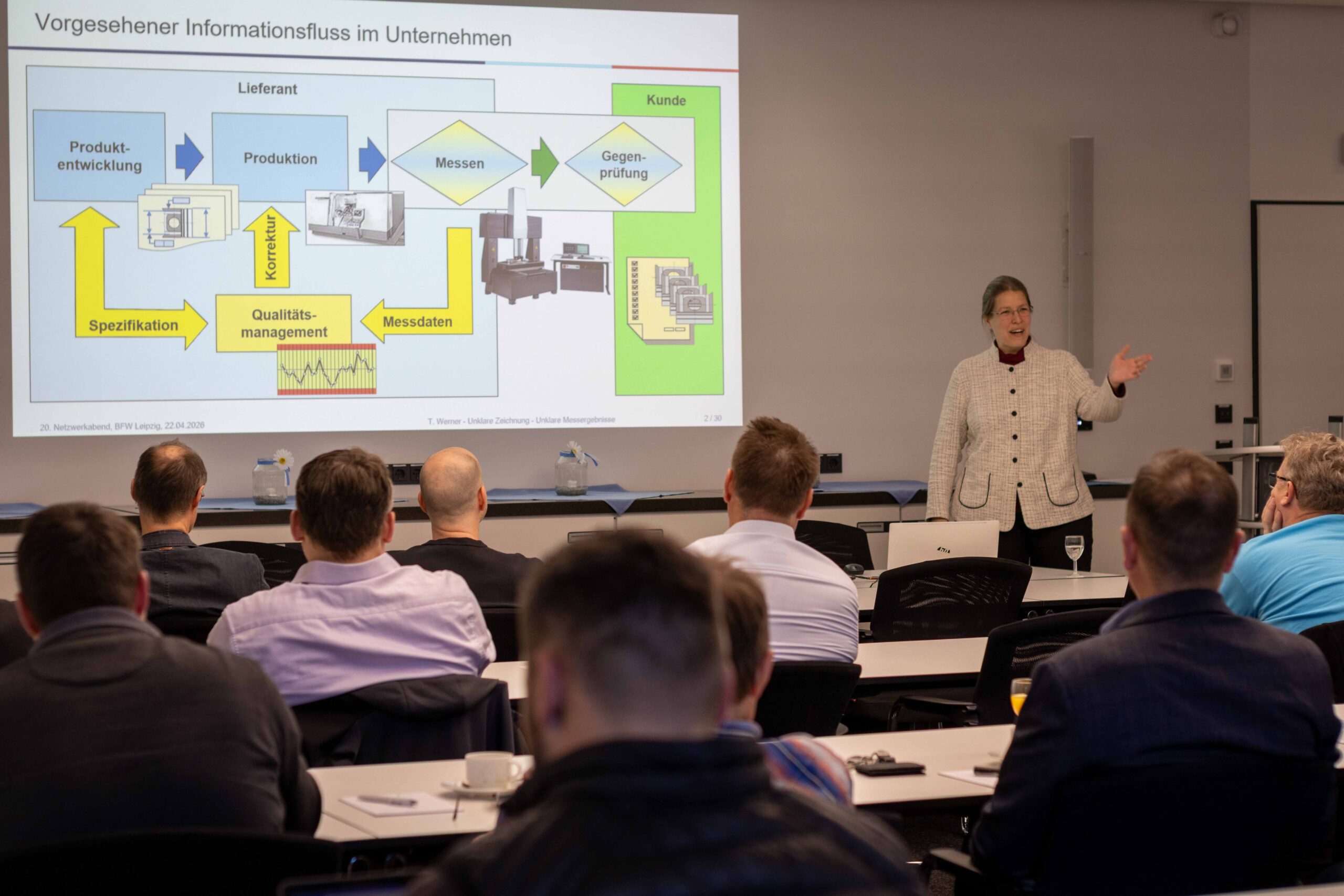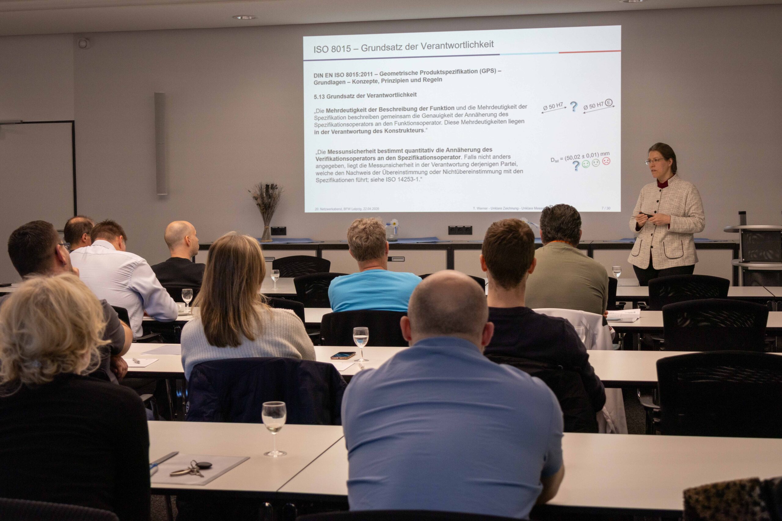 Nach der Begrüßung durch Markus Kinds, Leiter des DGQ-Regionalkreises Leipzig, stand im Zentrum des Abends das Fachreferat von Prof. Dr.-Ing. Teresa Werner, Professorin für Fertigungsmesstechnik/Qualitätsmanagement an der Westsächsische Hochschule Zwickau, zum Thema „Unklare Zeichnungen – unklare Messergebnisse“. Dabei wurde schnell deutlich: Was auf den ersten Blick eindeutig erscheint, ist in der Praxis oft interpretationsbedürftig.